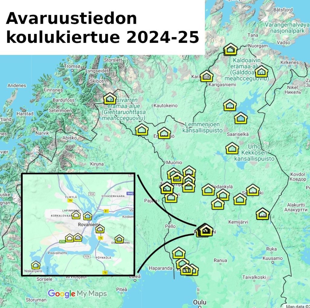 Here’s a listing of the places we visited. We started from Rovaniemi where we visited several large schools for several days and also the school science week.